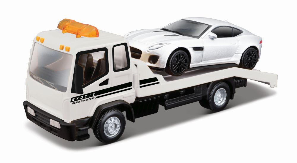Bburago 1:43 STR FIRE Flatbed Tow Truck, w/Jaguar F-Type R Dynamic (V6)