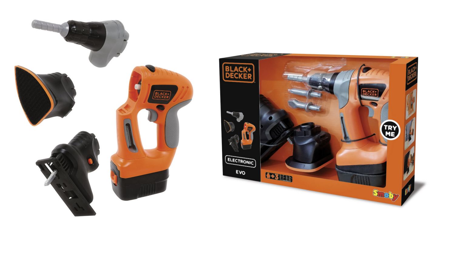 Nářadí3 v 1 v licenci Black & Decker. Vyměnitelné nástavce. V jednom produktu je obsažena vrtačka, bruska a přímočará pila.