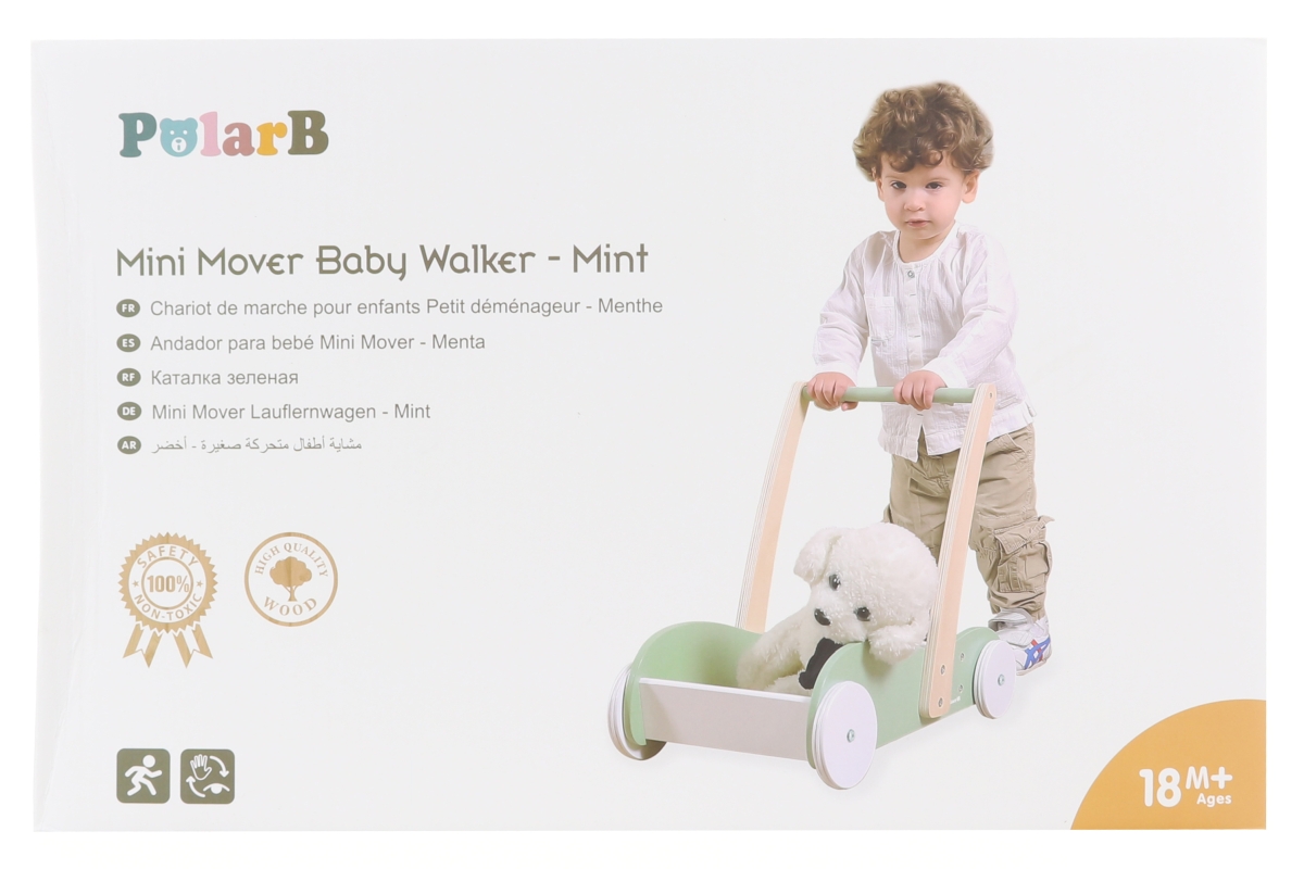 Dřevěné chodítko zelené pro rozvíjení dětské chůze a motoriky. rozměr chodítka cca 43,5 x 49 x 30 cm. Rozměr balení cca 50 x 32 x 17 cm. Věk 18m+.