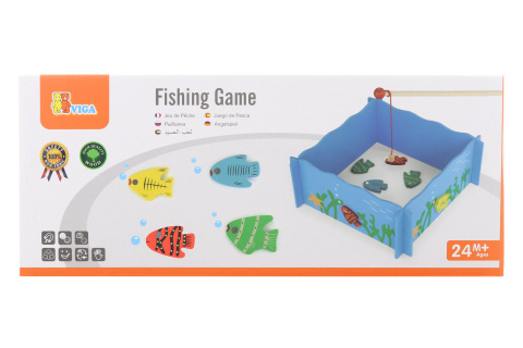 Dřevěné rybaření na magnet. Balení obsahuje rybářký bazének, 4 magnetické pruty a 20 rybiček a čísly. Rozměry bazénku cca 35 x 13 x 5 cm. Rozměry balení cca 37 x 16 x 5,5 cm. Věk 24m+