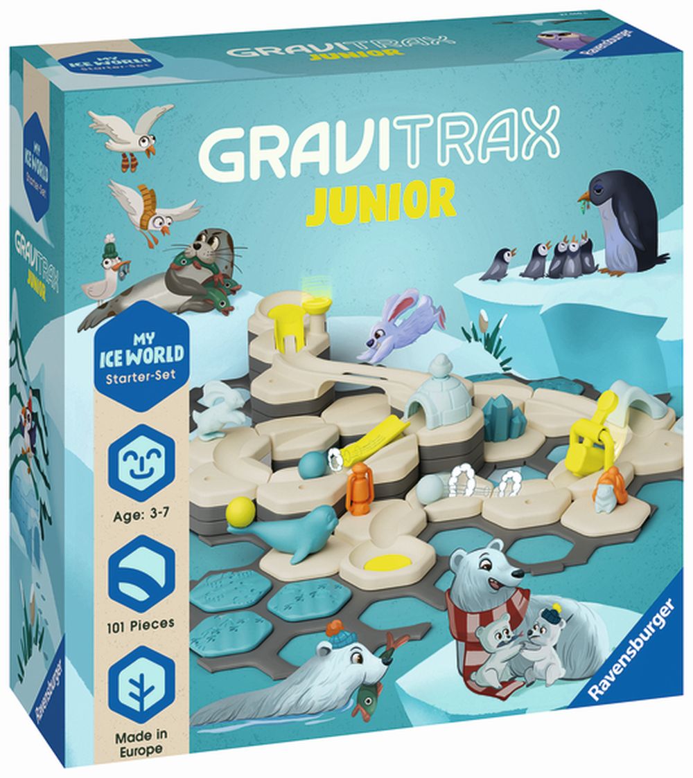 GraviTrax Junior je interaktivní systém kuličkové dráhy pro děti od 3 let. Ti nejmenší si staví své vlastní světy z kuličkových drah, které lze podle libosti zdobit a vytvářet tak jednotlivé tematické světy. Děti si tak při kreativním stavění užijí mnoho zábavy. Se startovní sadou GraviTrax Junior Ledový svět se mohou chlapci a dívky ve věku od 3 let okamžitě ponořit do dobrodružného světa plného ledu. Tato startovní sada obsahuje 101 dílků včetně akčních doplňků Houpačka a Kladivo, abyste mohli ihned začít stavět. Díky různým prvkům a figurkám zvířat a rostlin z dřevěného bioplastu zažijí děti od 3 let zblízka ledový svět, který si mohou při hře libovolně ozdobit.