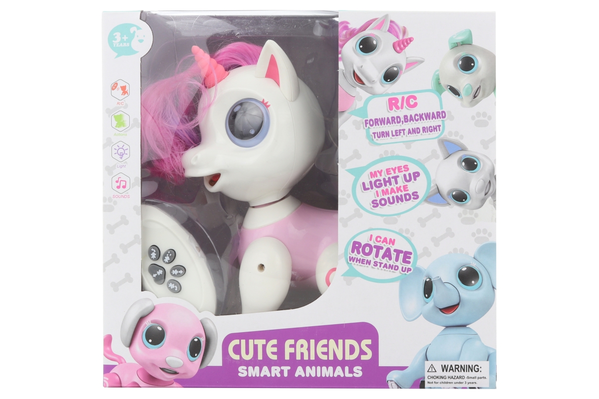 Jednorožec na dálkové ovládání. Jednorožec jezdí dopředu, dozadu, doleva a doprava. Vydává také zvuky, svítí mu oči a hýbe hlavou. Napájení jednorožce na 3 AAA baterie (nejsou součástí), napájení ovladače na 2 AAA baterie (nejsou součástí). Rozměry cca 16 x 21 cm. Rozměry balení cca 25 x 24 x 13 cm. Věk 3+