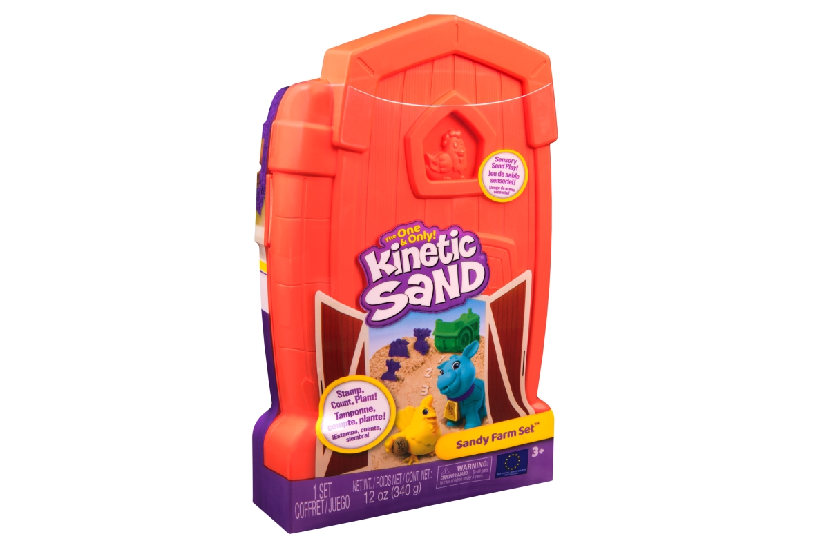 Farma se zvířátky a traktůrkem. Rozložte krabici na hrací podložku. Sada obsahuje figurky několika zvířátek, kterými lze do tekutého písku vytlačovat jejich charakteristické stopy. Také traktur zanechává své stopy. Věk 3+