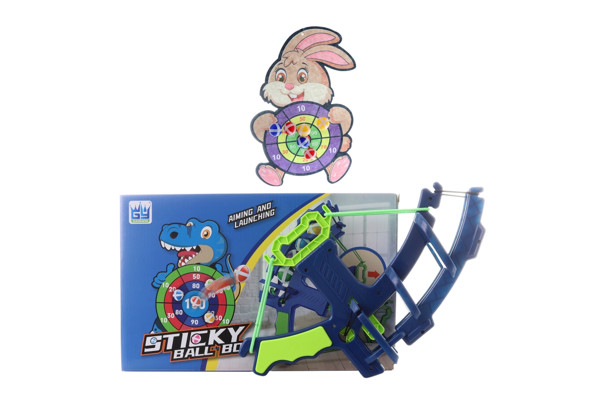 Kuše s terčem smotivem králíka. Materiál plast. Balení obsahuje kuši, terč, 6 míčků a háček na pověšení terče. Baleno v krabici. Rozměry balení cca 34x22x8 cm. Věk 3+