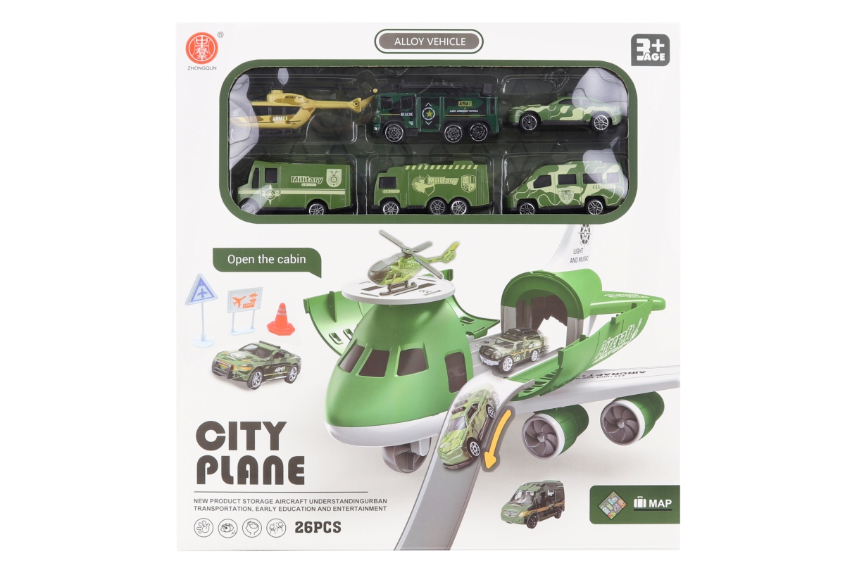 Rozkládací letadlo s autíčky. Letadlo lze rozložit na garáž pro autíčka. Součástí je 6 vojenských autíček a 1 helikoptéra. Rozměry balení cca 29 x 30,5 x 10,5 cm. Věk 3+