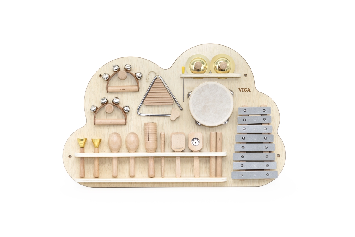 Nástěnná hra s prvky hudebních nástrojů. Rozměry desky 75x48x6,6 cm. Baleno v krabici. Rozměry balení cca 82x56x9 cm. Věk 3+