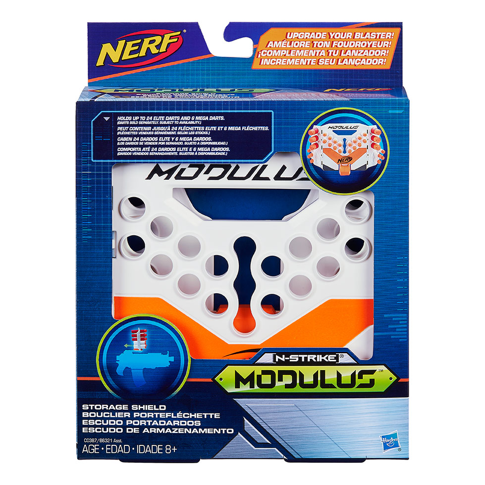 Doplň svoji bojovou výbavu a vylepši si svůj blaster! Tento štít pro zásobník je kombinovatelný se všemi blastery Nerf Modulus. Štít ukryje 24 šipek Elite a 6 Mega šipek, zároveň má 3- bodový průzor. Rozšiřte své bojové schopnosti s Nerf Modulus Upgrade. S plným systémem Nerf Modulus je možné vytvořit až 1000 různých kombinací. Pistole, šipky a příslušenství jsou prodávány samostatně.
