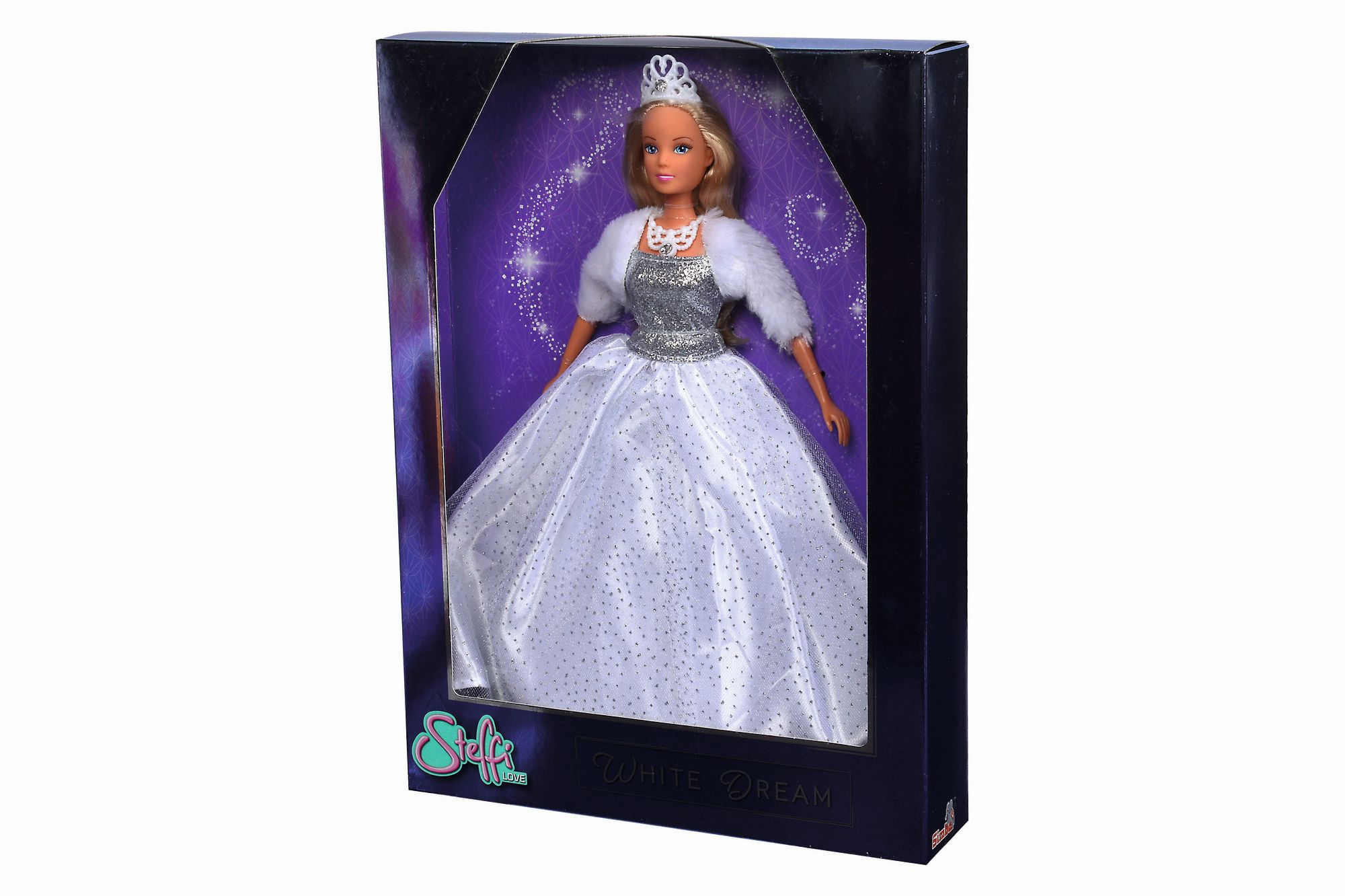 Panenka Steffi v nádherných bílých šatech, s náhrdelníkem a tiárou s kamínkem. Výška panenky 29 cm.
