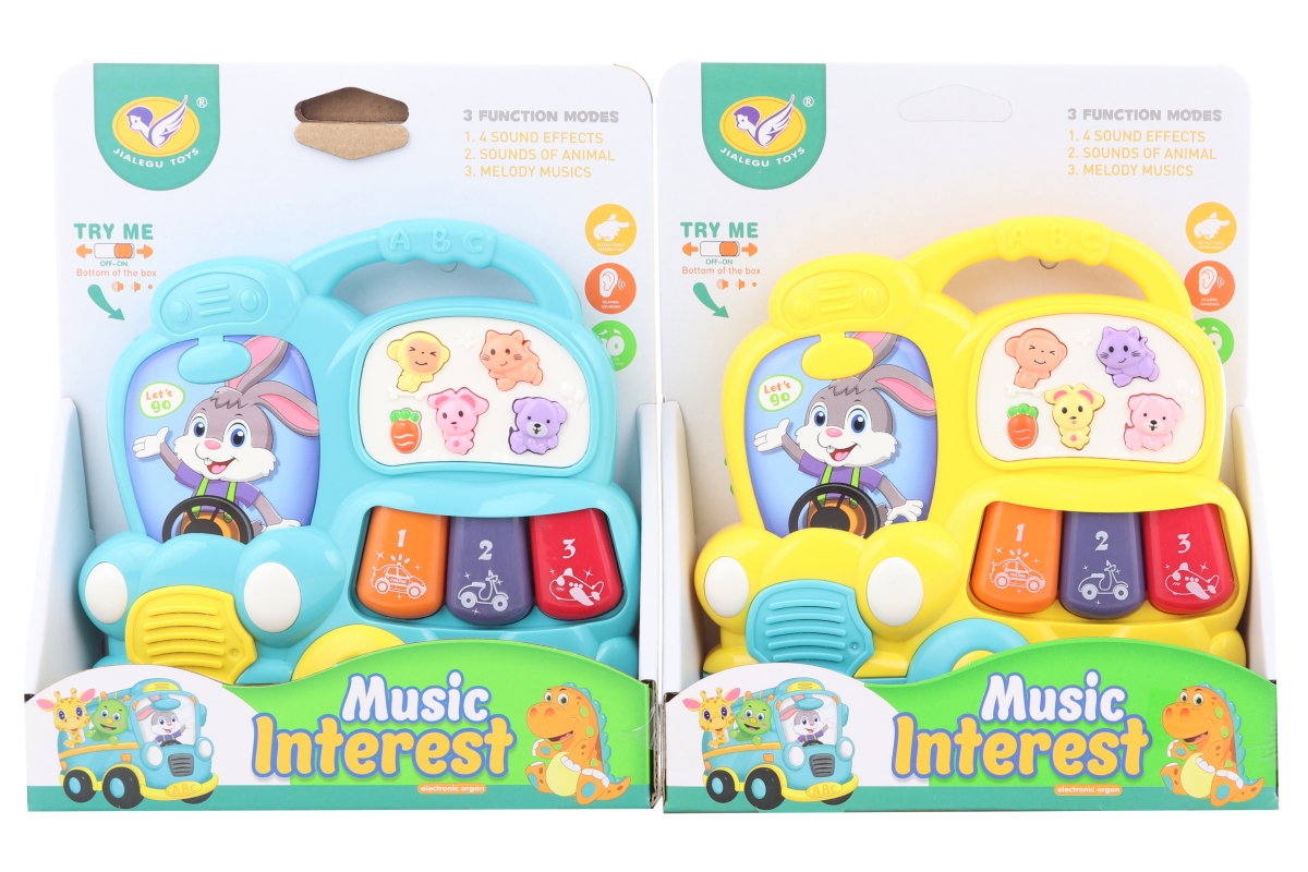 Plastové piánko ve tvaru autobusu. Hraje a vydává zvuky zvířátek. Napájení na 2 AA baterie (jsou součástí balení). Rozměry piánka cca 14,5 x 15 cm. Rozměry balení cca 16 x 19 x 5 cm.