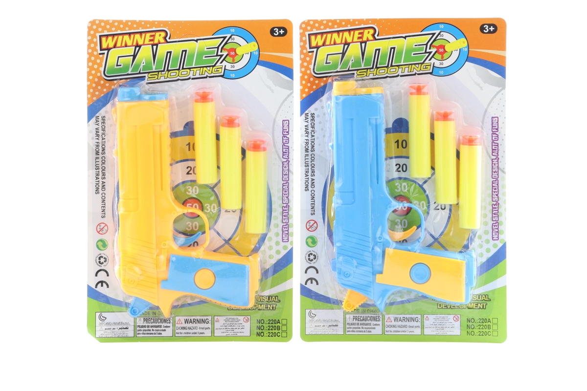 Plastová pistole s pěnovými náboji. Barevnost dle dostupnosti. Rozměr pistole 15 x 9 x 2 cm. Rozměr balení cca 21,5 x 13,5 cm. Věk 3+
