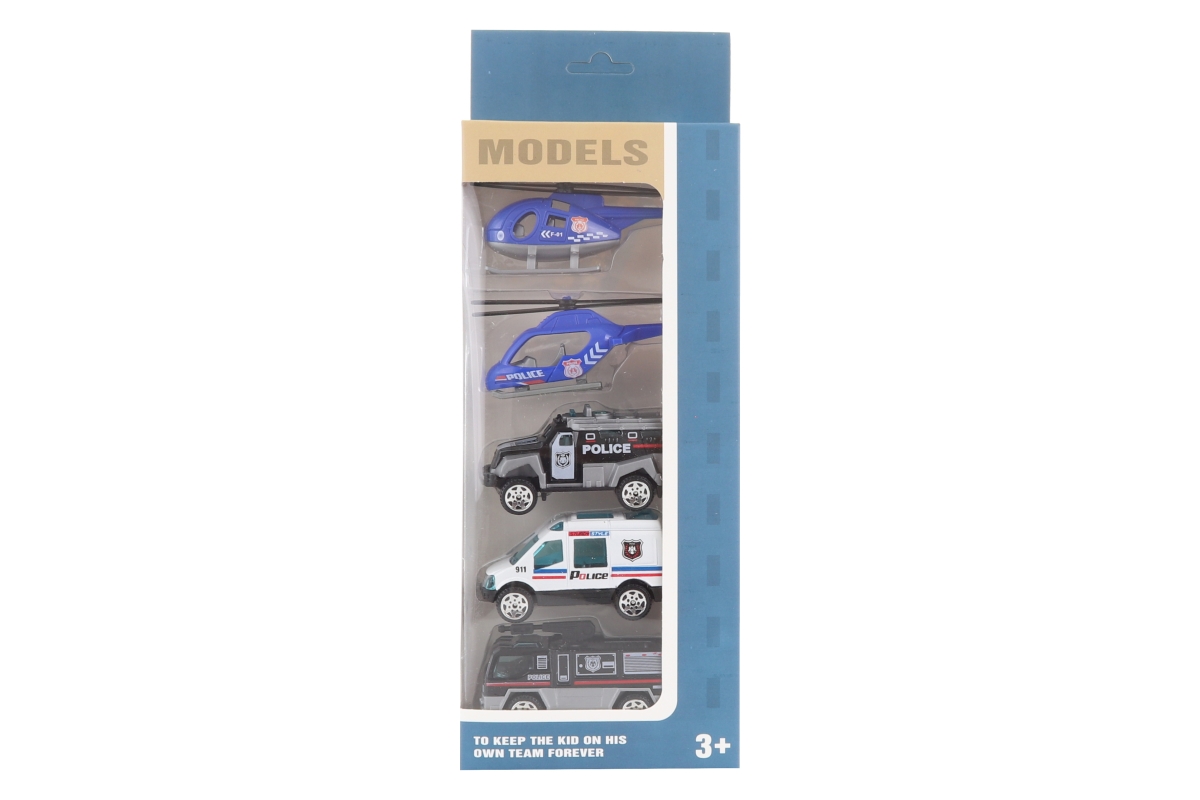 Sada policejních kovových aut. Balení obsahuje 2 helikoptéry a 3 auta. Rozměry balení cca 10 x 27 x 3,5 cm. Věk 3+