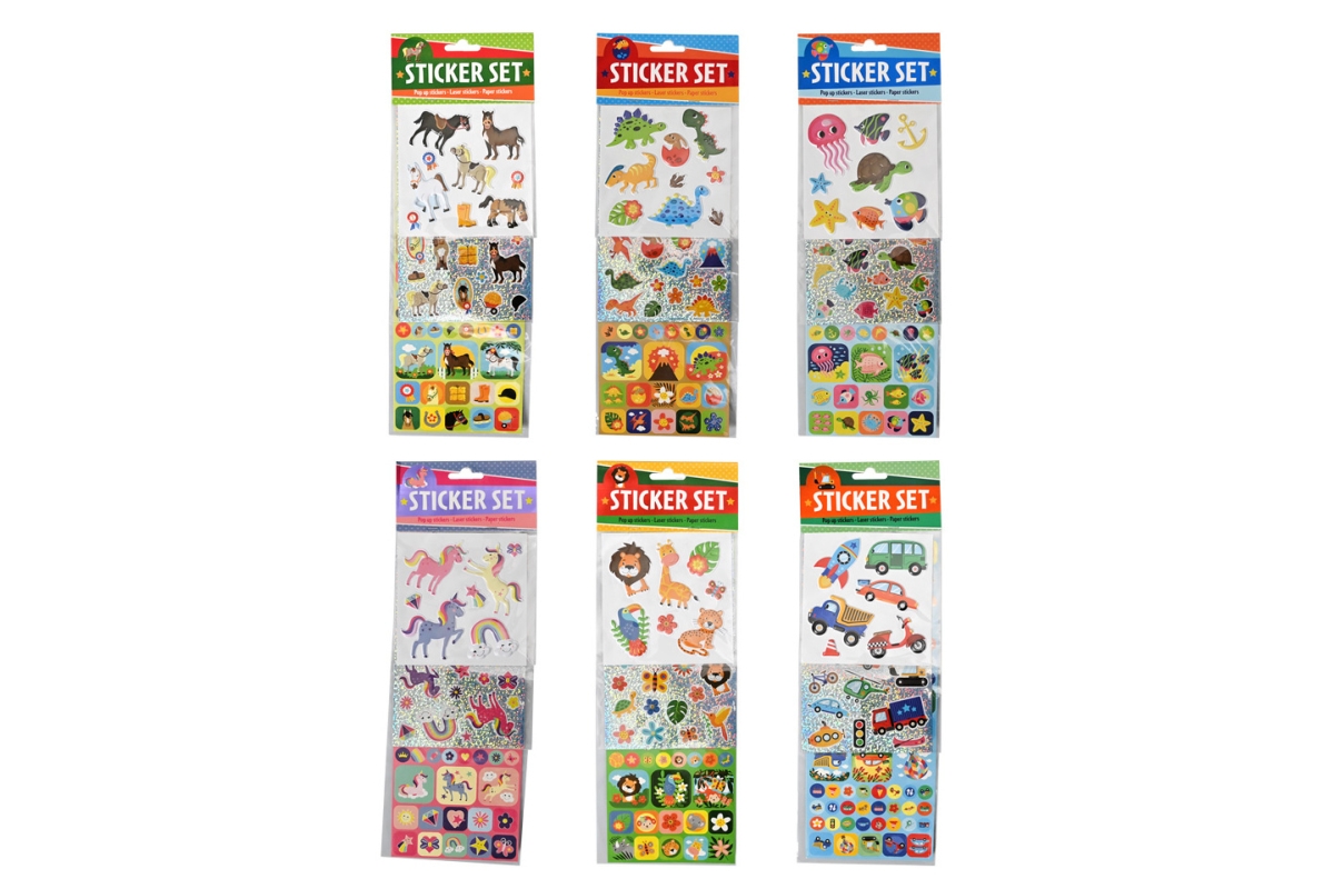 Sada samolepek – 1 arch samolepek různých velikostí a tvarů, 1 arch třpytivývých samolepek a 1 arch 3D samolepek. Rozměry balení 12×34 cm. Věk 3+