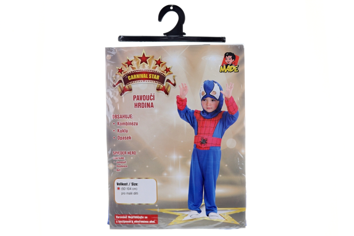 Karnevalový kostým pavoučí hrdina pro děti o velikosti 92-104 cm. Balení obsahuje kombinézu, kuklu a opasek. Materiál polyester. Rozměry balení cca 30x48x2 cm.