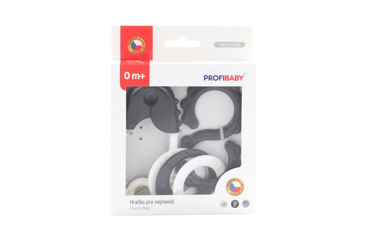 Chrastící černo-bílý set pro nejmenší děti, obsahující tvary v podobě osmičky, kancelářské sponky a srdíčka.. Hračka má lehkou konstrukci a správnou velikost pro ruku malého dítěte. Rozměry balení cca 12,5 x 16 x 3,5cm. Rozměry špendlíku cca 12 cm. Věk 0+