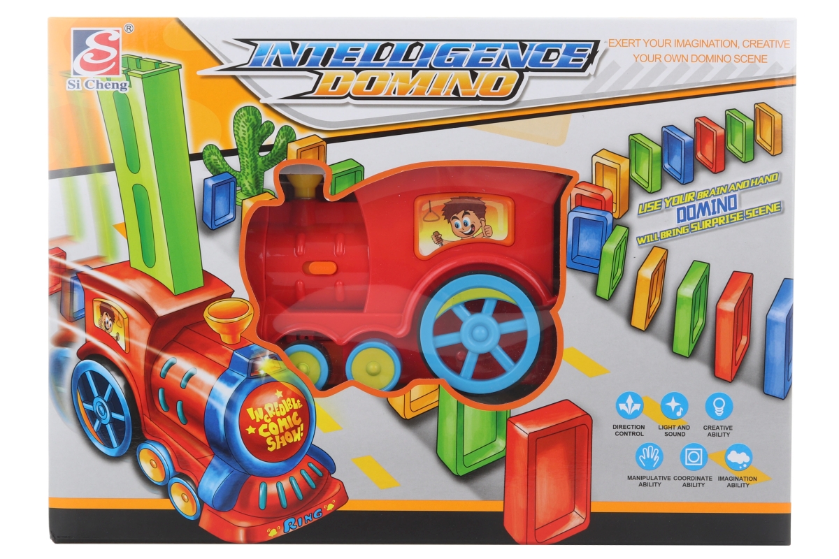 Stavěcí domino vláček obsahuje krásný červený vláček o velikosti cca 14 x 11 cm. Napájení na 2 AA baterie (nejsou součástí balení). Do vláčku se nasadí tyč,ve které je uloženo domino. Při jízdě domino vypadává z vláčku a staví se za sebou.Vláček svítí a cinká. Při nárazu změní směr jízdy a jede dál. Rozměry balení cca 33 x 23,5 x 8,5 cm. Věk 3+