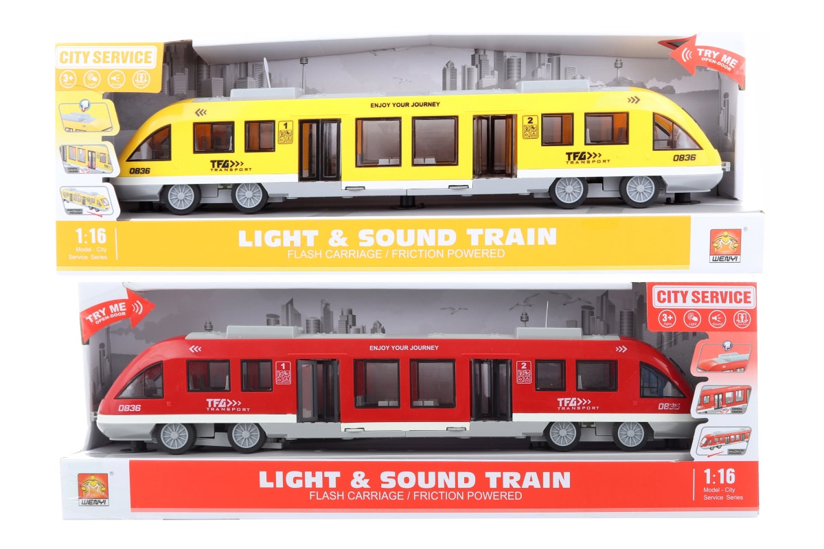 Plastový vlak na baterie. Vlak vydává zvuky a svítí. Rozměry cca 44,5 x 5,8 x 9 cm. Napájení na 3 AG13 baterie (jsou součástí). Rozměry balení cca 48 x 11 x 16,5 cm. Věk 3+