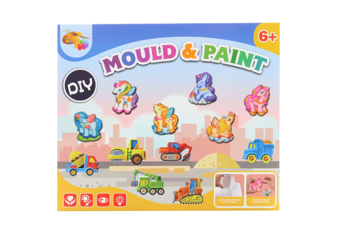 Balení obsahuje sádru, plastový kelímek, plastovou misku, plastovu formu s 6 různými motivy, 8 barviček k vybarvení, 2 štětečky,plastovou lžičku a dřevěnou špachtličku. Rozměry balení cca 22 x 18,5 x 5 cm. Věk 6+
